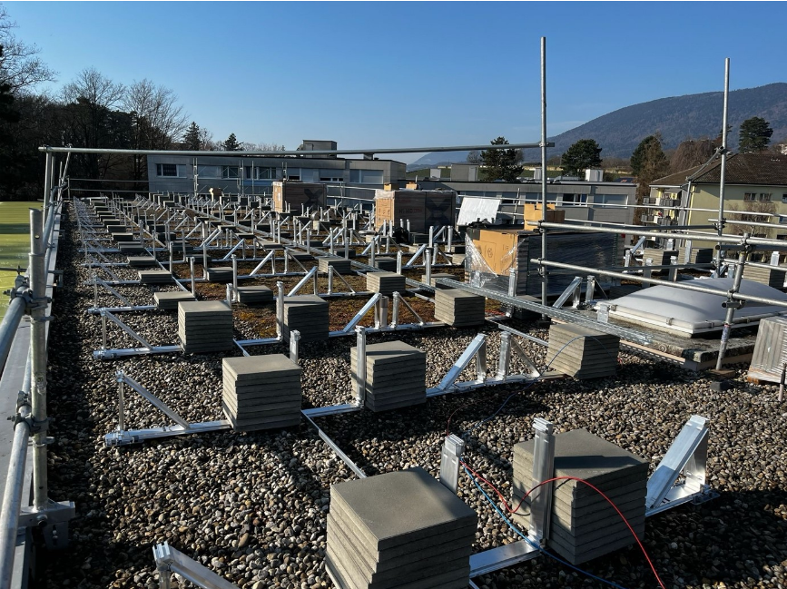 Socles prêts à recevoir les modules photovoltaïques sur le toit du collège des Mûriers